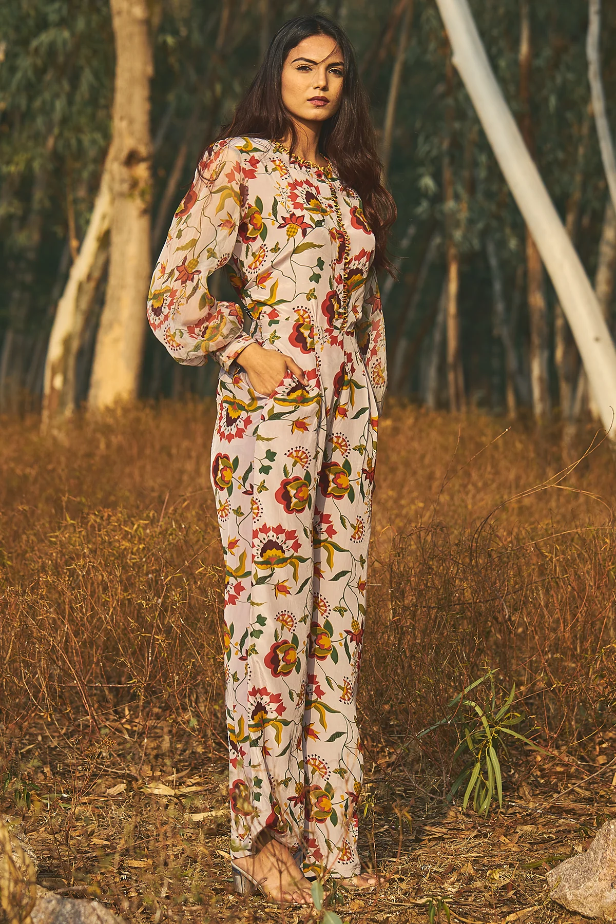 This Cassia pant shirt set of 2 has natural crepe shirt with round neckline finished with the loops, along with sheer chiffon balloon sleeves. It is paired with trouser crepe pants.