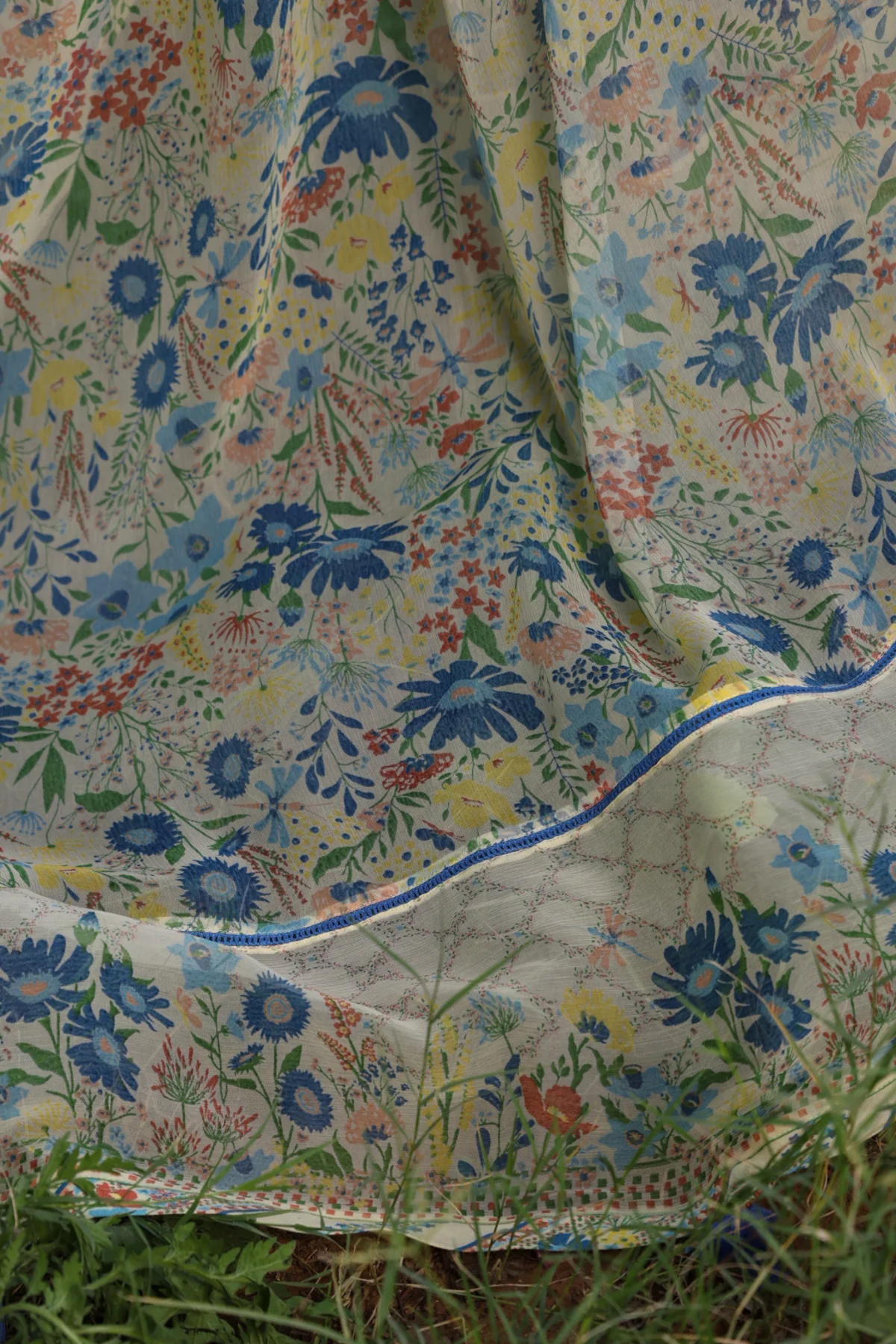 Eliana is a chiffon yellow printed saree with a running broad printed border connected using a connecting lace, stripe border at the hemline and a pallu that ends in 5 stunning tassels. It is paired with a floral stripe blouse piece.