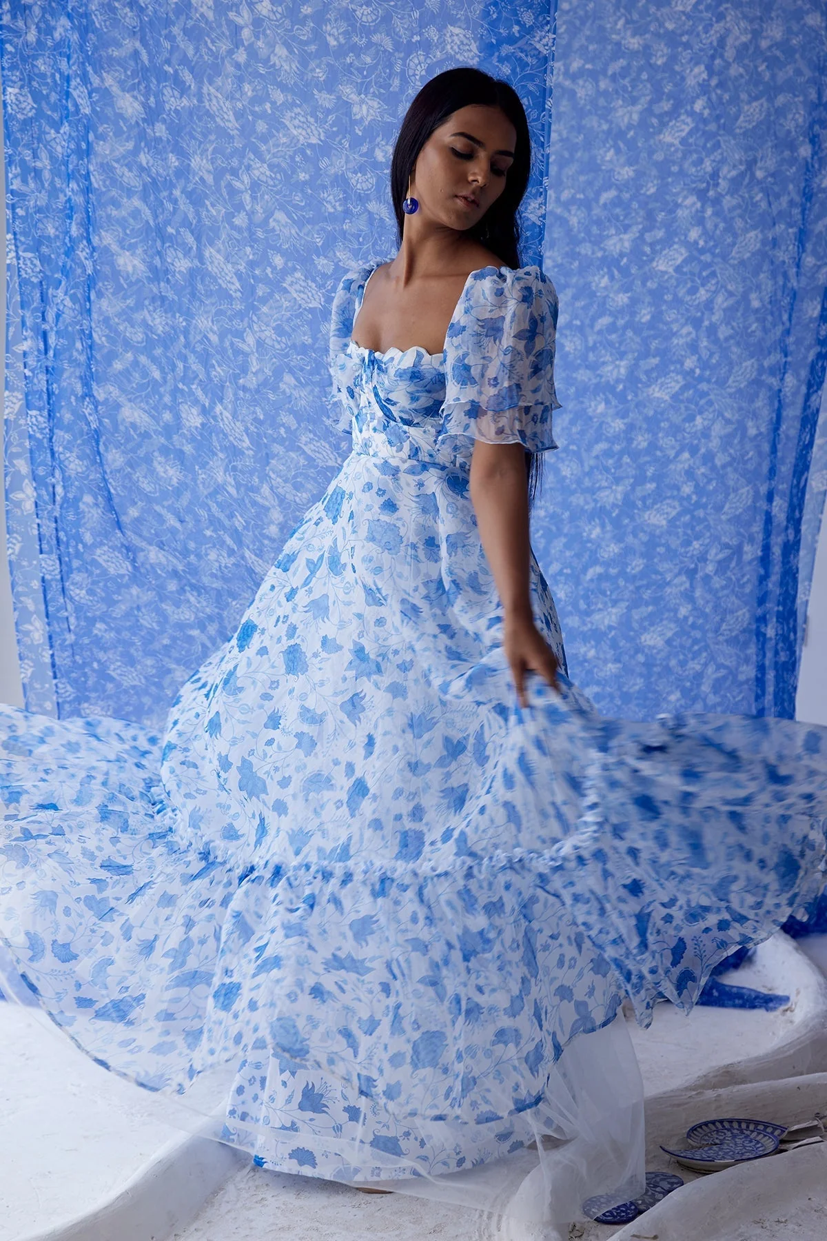 Your party dress just hit a new level. This is a beautiful organza dress with a bustier look and enhancing layers on the torso with a back zipper opening. It has a sleak ghera that reaches the floor with a tiered gather. A double layered sleeve finish with slight puffs.