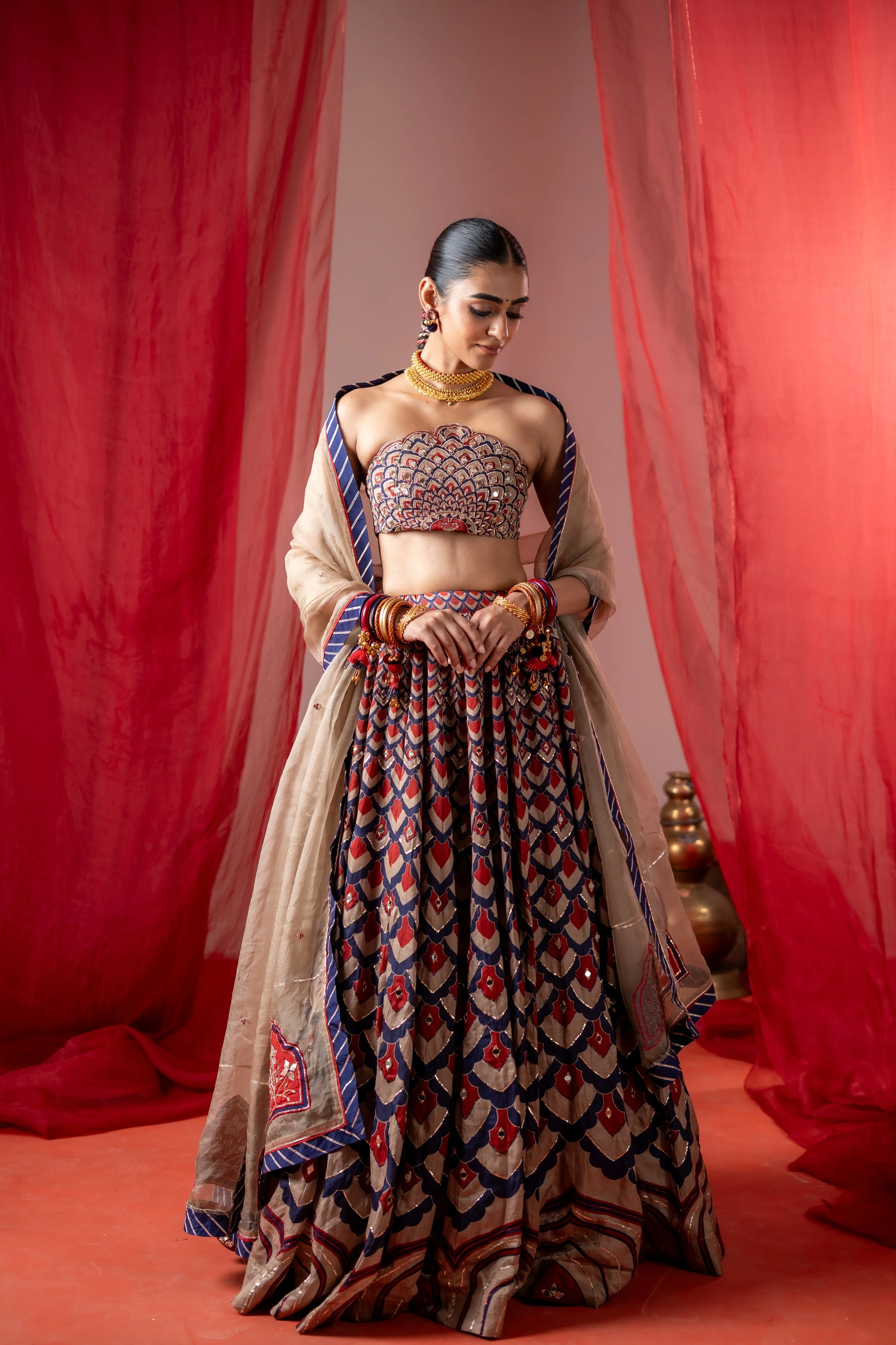 This contemporary off-shoulder lehenga set features a striking motif on the blouse inspired by Jaipur's architecture, echoing patterns in deep red, navy, and beige, and a beautiful arch shaped neckline. The voluminous skirt showcases the architectural pattern, creating a rhythmic, almost feathered texture. The bold patterning and structured silhouette make it ideal for modern festive occasions with a touch of regal flair.