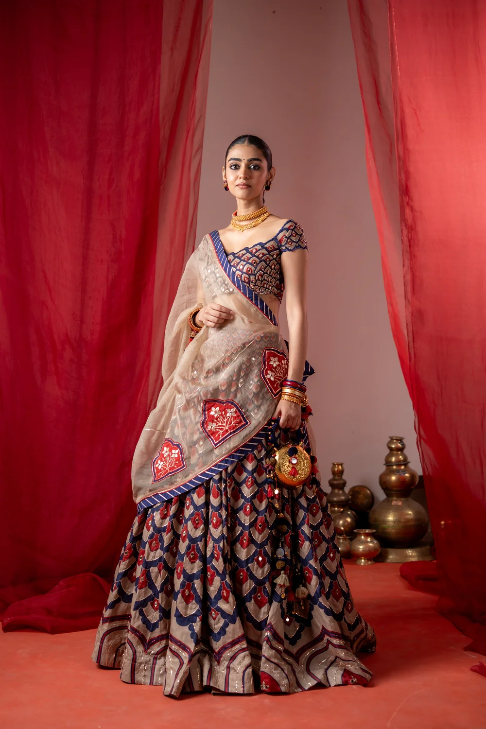 This contemporary lehenga set features a striking motif on the blouse inspired by Jaipur's architecture, echoing patterns in deep red, navy, and beige, and a beautiful arch shaped neckline. The voluminous skirt showcases the architectural pattern, creating a rhythmic, almost feathered texture. The bold patterning and structured silhouette make it ideal for modern festive occasions with a touch of regal flair..