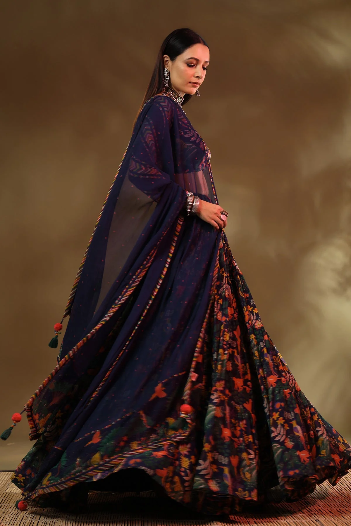 Kudrat is a beautiful tiered lehenga set with a full sleeves blouse having elasticated cross back detailing and dupatta.