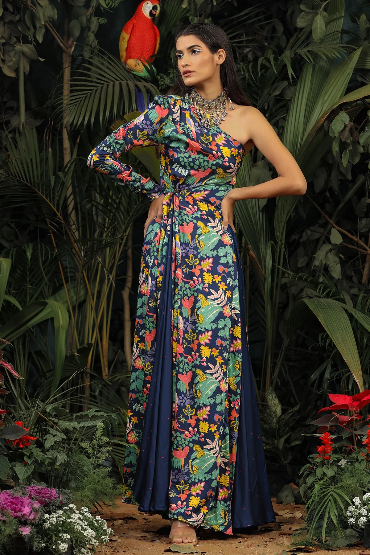 Maahroo is a one-shoulder gown with a twisted detail on the stomach, pleated shoulder with full sleeve and fabric panels joined from the waist to hem.