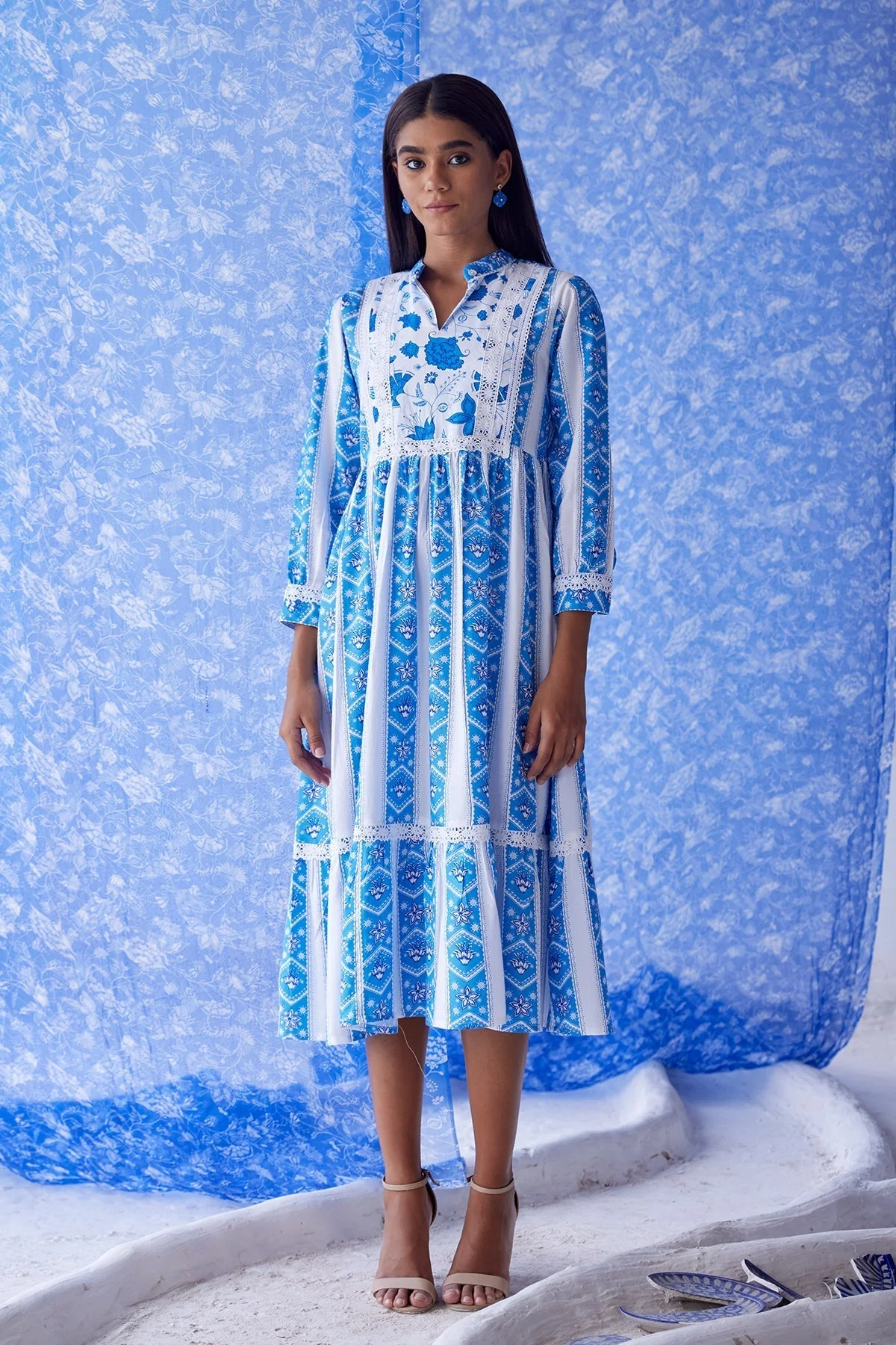 This is a tiered, calf length dress with 3/4th length puff sleeves and a laced yoke.