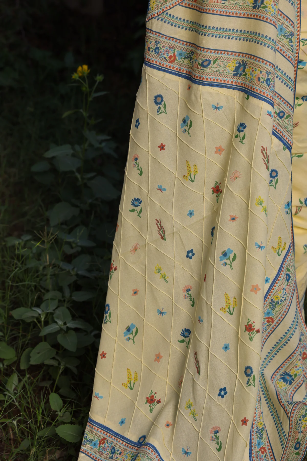 Serenitee is a yellow printed saree with a floral printed border connected with a star matte lace. The pallu is intricately designed with diamond pleating and floral stripe border placed diagonally, connected with a contrasting connecting lace. It is paired with a floral stripe blouse piece.
