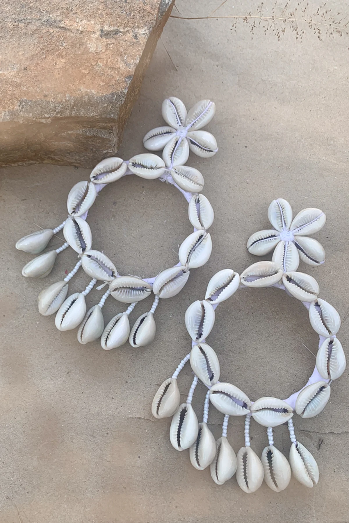 Seashell statement earrings are handmade and made of cloth, seashells, and metal.