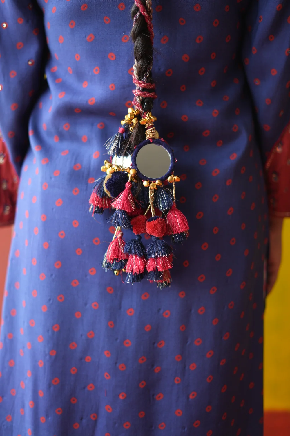 The Thumri Paranda Set showcases voluminous, dramatic tassels made from red and blue threads, adorned with mirrors, beadwork, and ghungroos. Each tassel features a three-tier design for added volume, with each dori displaying a mix of multicolor small tassels in red, blue, beige threads. These three doris are combined to create a bold and eye-catching paranda, perfect for adding a statement look to any ensemble.
