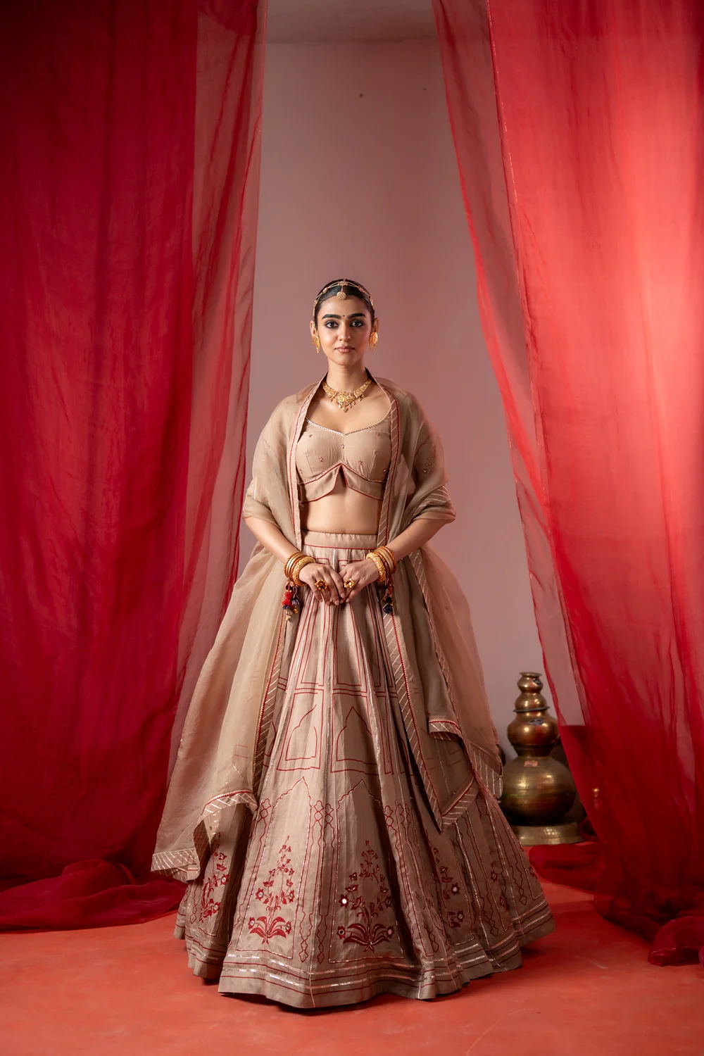 This lehenga is a dazzling dance of tradition and modern flair! Stealing the spotlight is its lively print and intricate embroidery on muted tones. It is paired with a blouse inspired by the Rajasthani kanchli, boasting sculpted, embroidered cups, and delicate contrast piping. This ensemble is a bold, sculptural masterpiece that screams festive fun! It's your go-to for evening soirees and festive bashes where tradition waltzes with elegance.