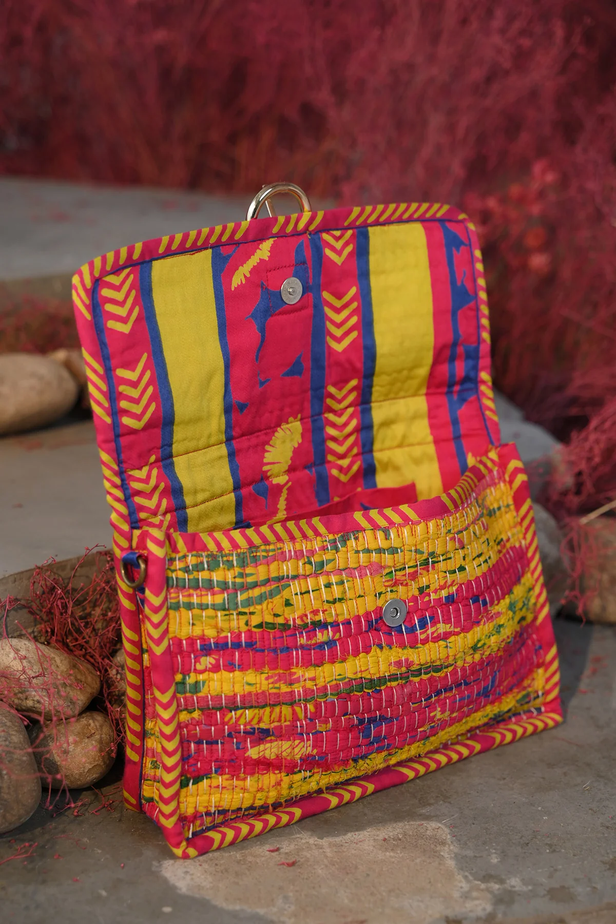 A comfortable handbag made from upcycled fabric scraps. It has a flap closure with magnetic button and a decorative buckle. It's spacious enough to carry all utilities and has a strap handle for comfortable travel
